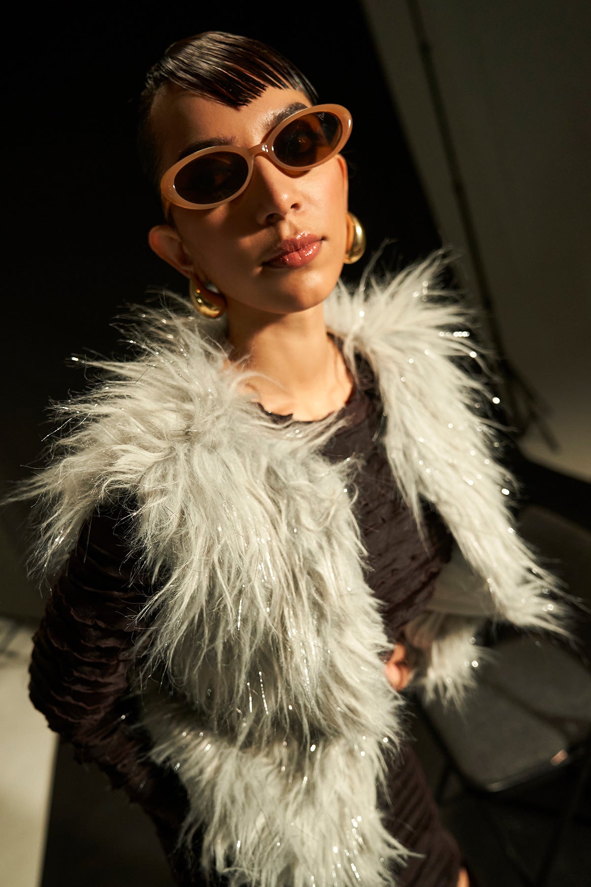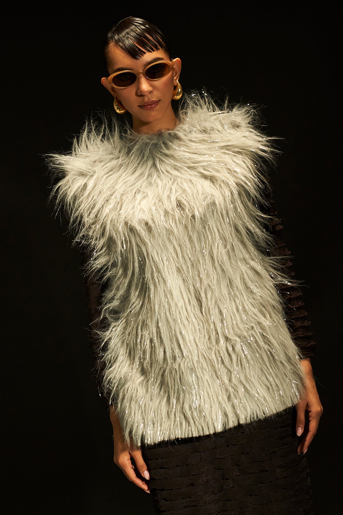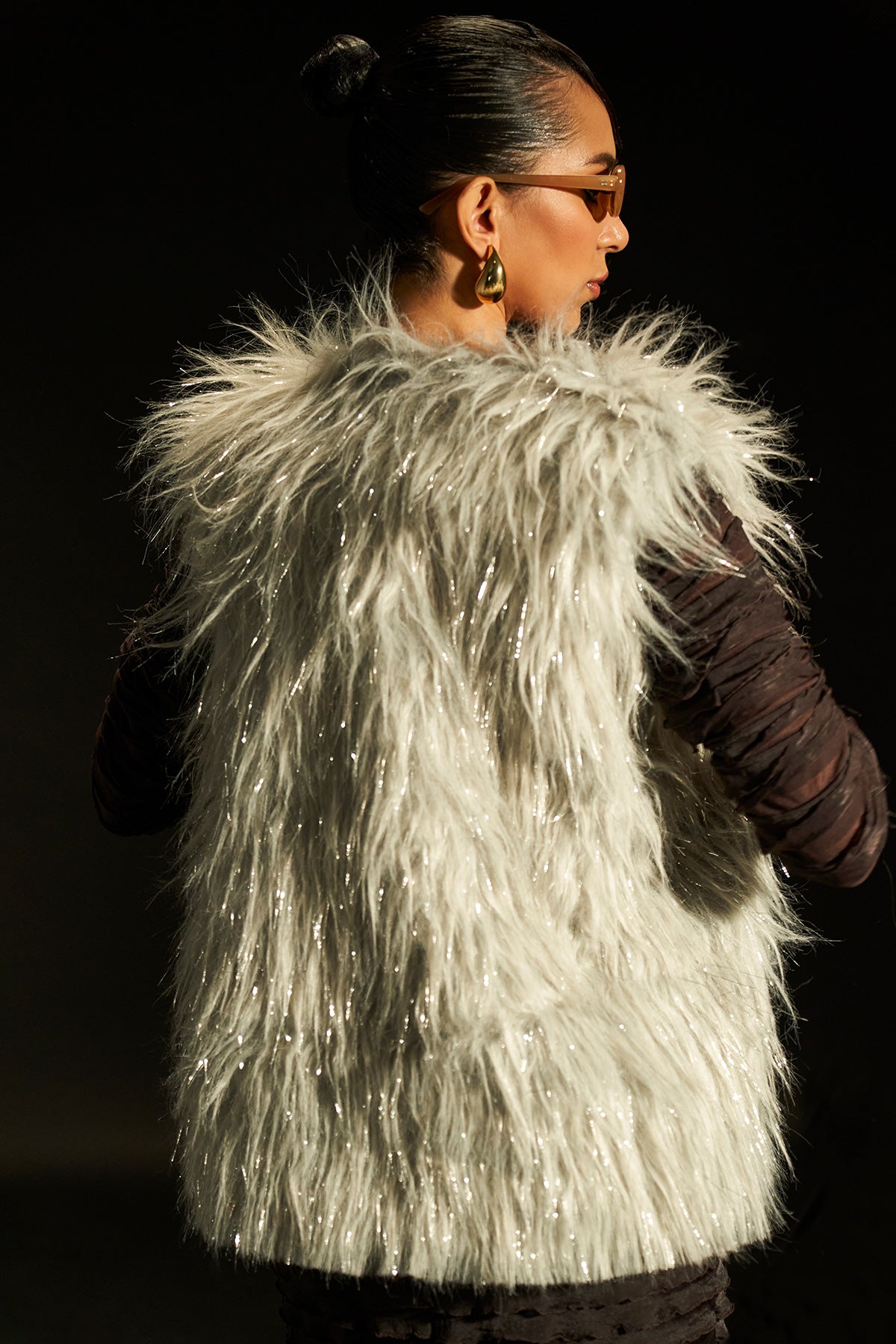 Featuring The Ice Grey Lurex Fur Jacket Without Sleeves