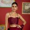 featuring the contemporary maroon dori work blouse , paired with a drape style dhoti skirt .