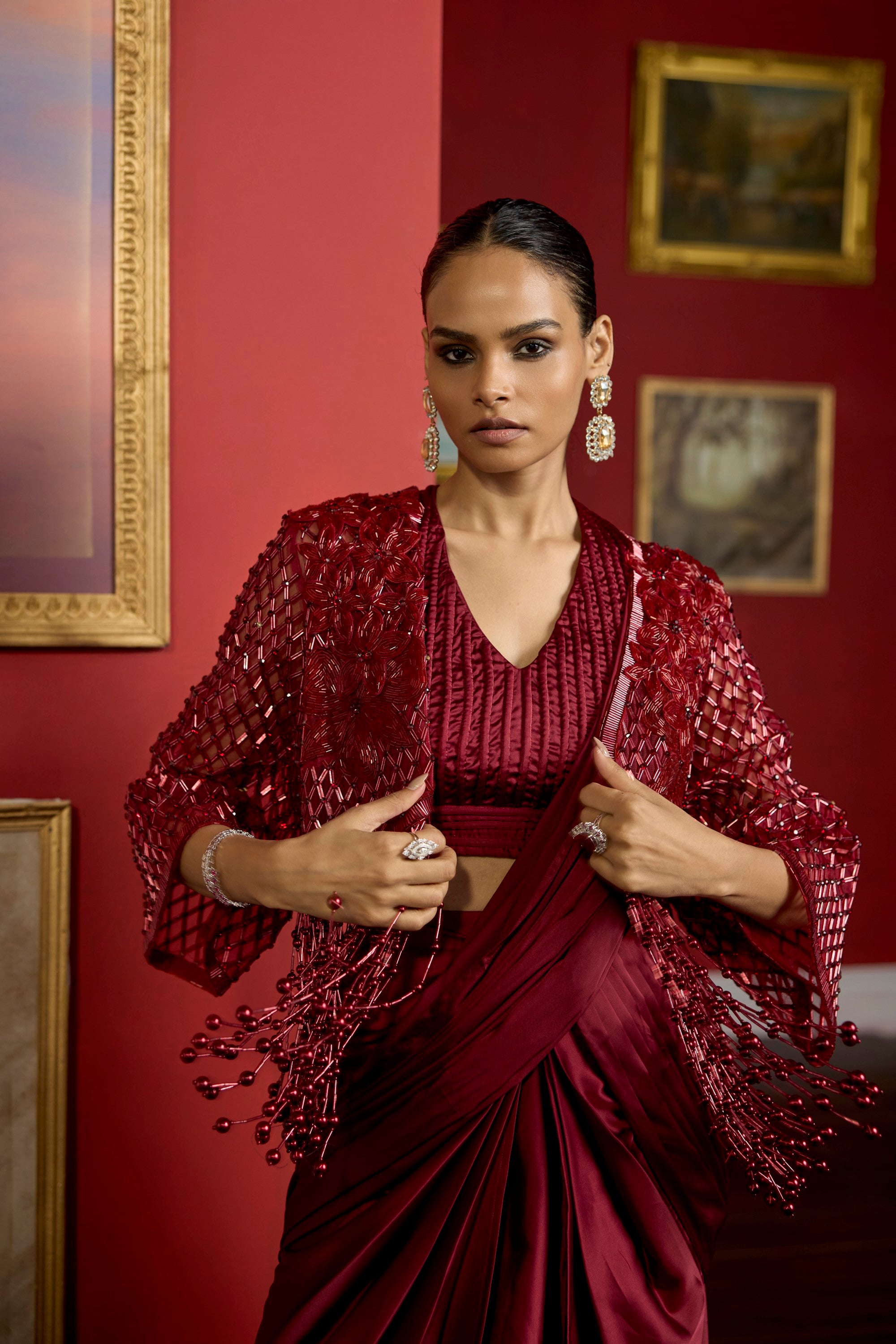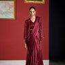featuring the maroon crystal kardana work jacket with pearls , draped with a pre-stiched armani satin saree and a dori work blouse
