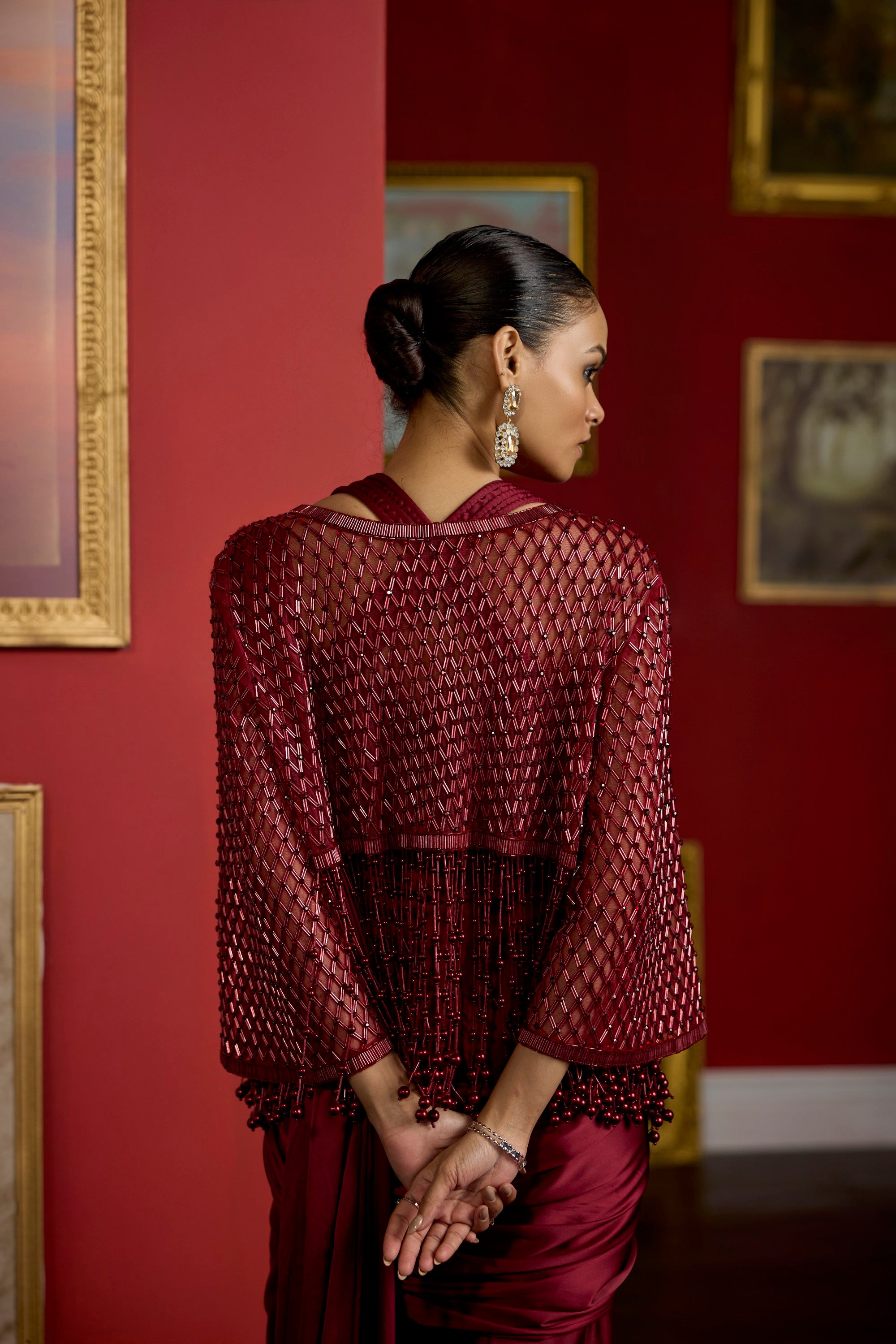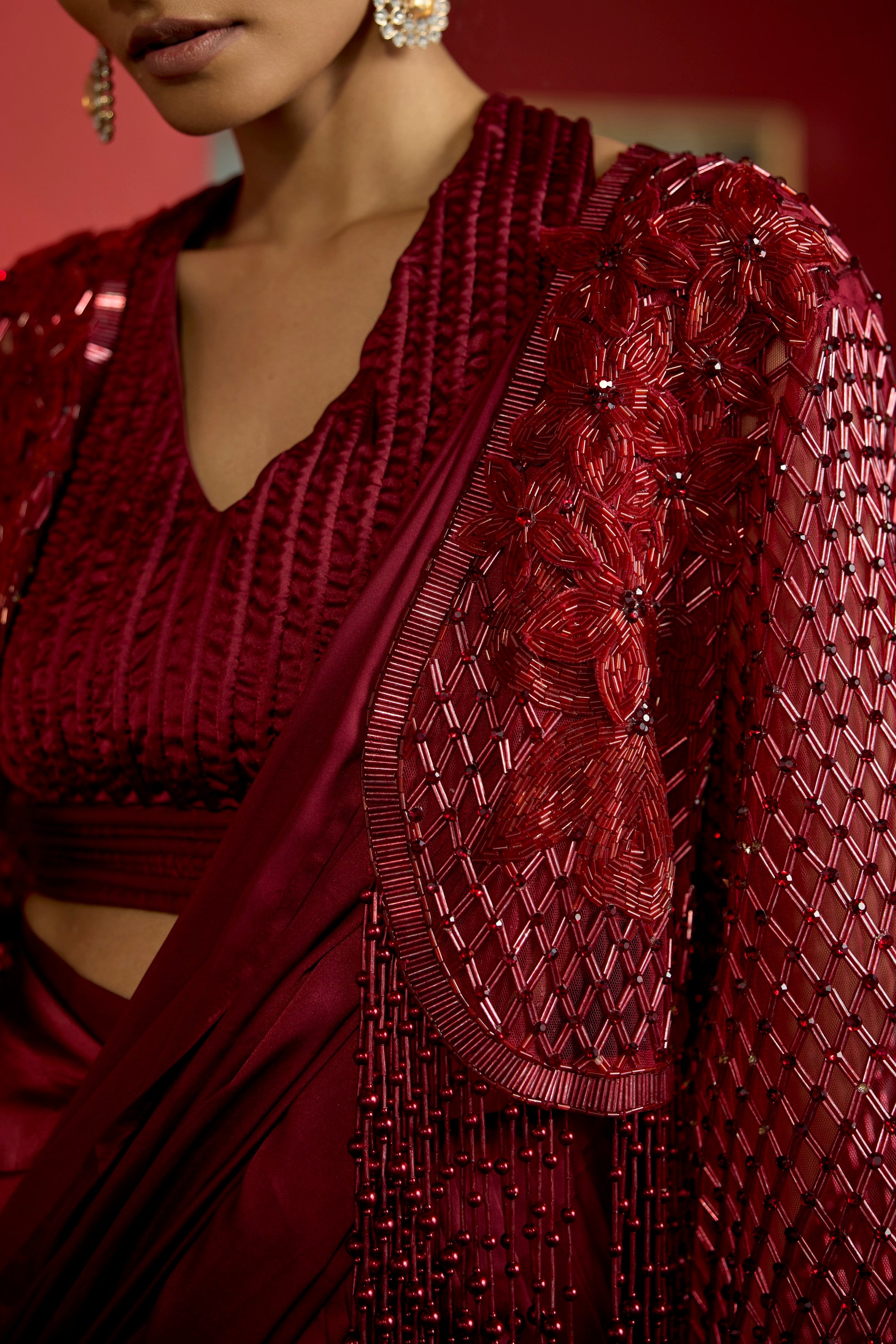 maroon pearl jacket saree