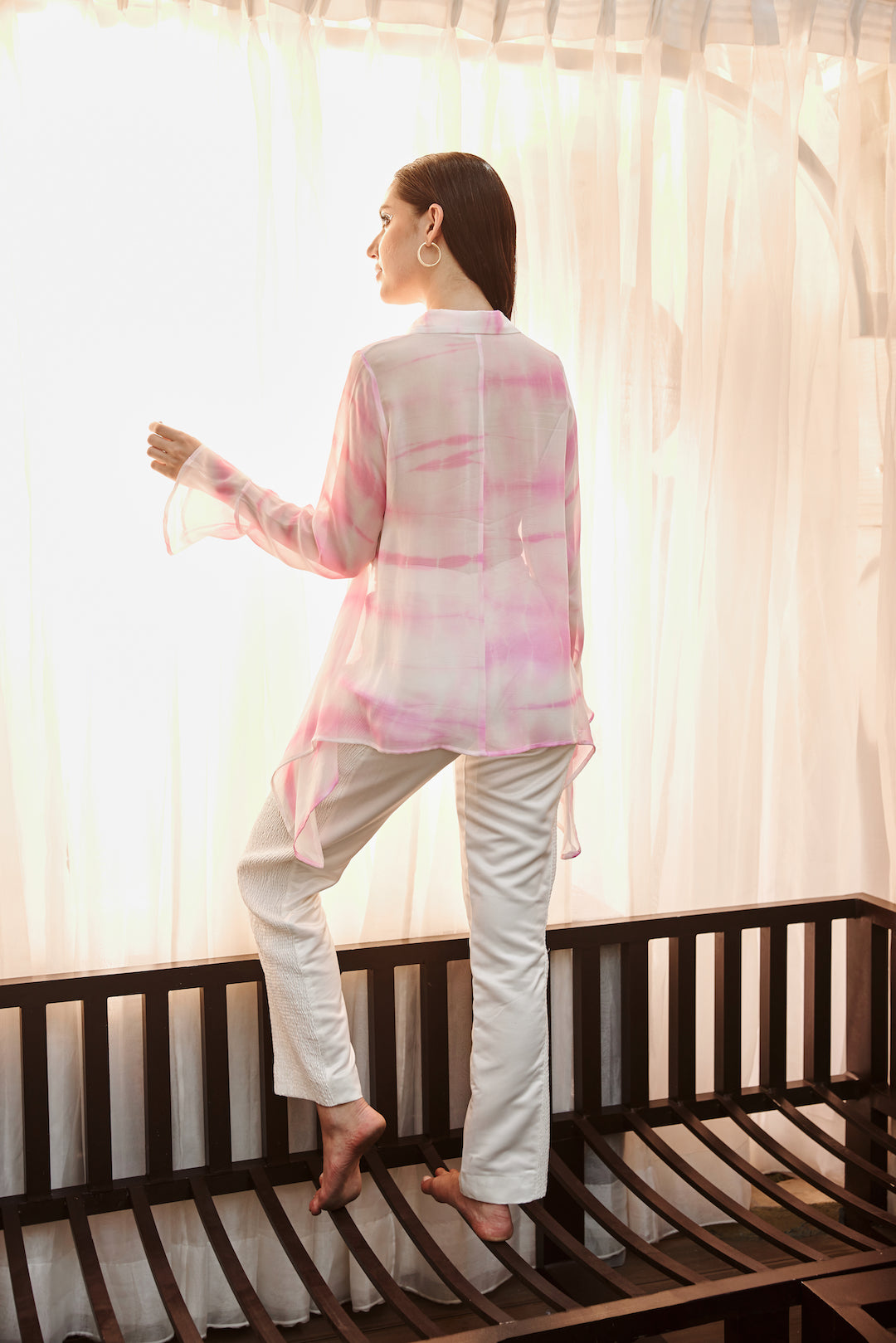 Tye dye kaftan shirt with smocked side detailed white classic trouser pants coord set