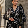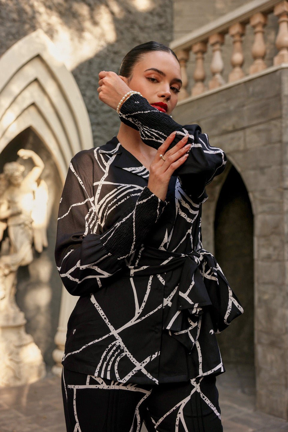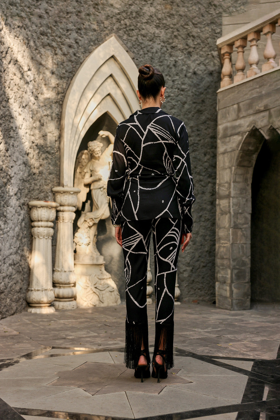 Featuring the black wave knot shirt paired with fringe pants.